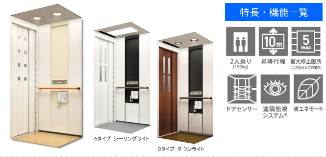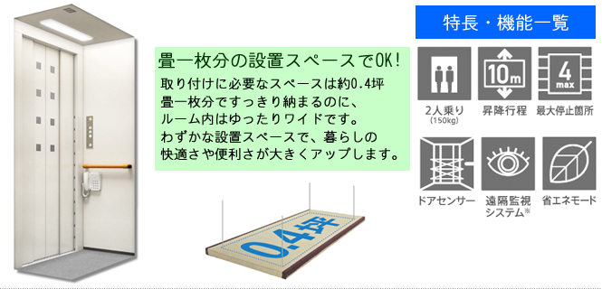| ■コンパクト2人乗り・・・・・省スペースの2人乗りなら、建物設計の自由度がアップ。 |